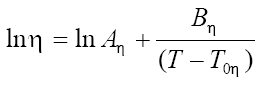 where η is the viscosity in Pa.s units, T is the temperature in K and Aη, Bη and T0η are adjustable parameters. The ratio of parameters Bη, T0η and Bη/T0η is also known as Angell strength parameter. It was found that the optimum value of T0η is 165.06 K. Aη and Bη can be obtain by group contribution method according to